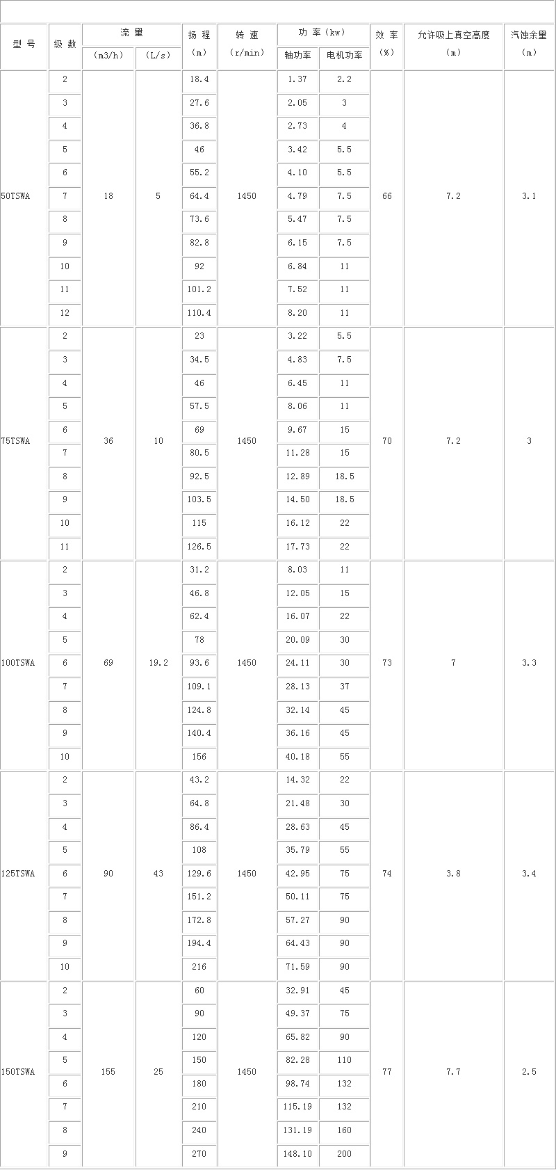 TSWA型多級離心泵系我單位開發(fā)生產(chǎn)的節(jié)能系列產(chǎn)品,具有運行噪聲低、抗汽蝕性能好、結(jié)構(gòu)合理、使用壽命長等優(yōu)點。TSWA型臥式多級離心泵全系列共有5個品種40個規(guī)格,使用性能范圍:流量Q=15~199m3/h,揚程H=17~247m,轉(zhuǎn)速n=1450r/min。可供輸送80℃